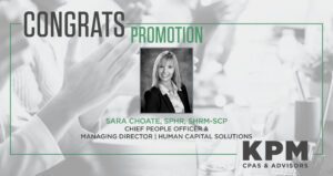 Springfield, MO – KPM CPAs & Advisors (KPM) is excited to announce the promotion of Sara Choate, SPHR, SHRM-SCP to Chief People Officer. In this role, Sara is responsible for