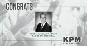 KPM proudly announces that Austin Russo, a staff accountant at the firm, has successfully earned his Certified Public Accountant (CPA) license after completing all four sections of the CPA examination,